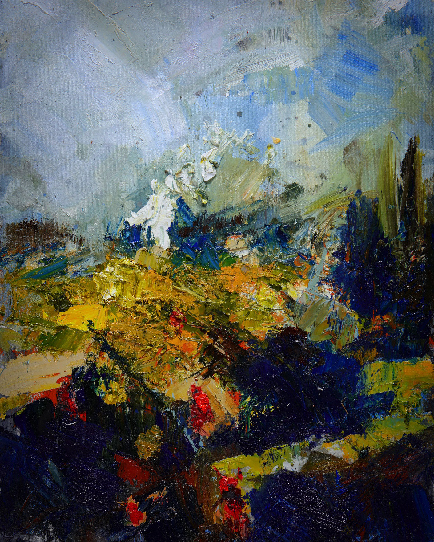 Right: 'Figures in a field', 2018, oil on canvas, 22 x 27 cm